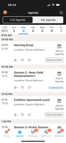 The conference itinerary, including all technical sessions and social events, can be found by clicking Agenda at the bottom of the Whova home screen.
