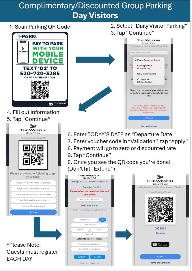 Day Visitors/Not staying at Hotel: Follow the instructions below each day, and use the Validation Code: AEF10CAC