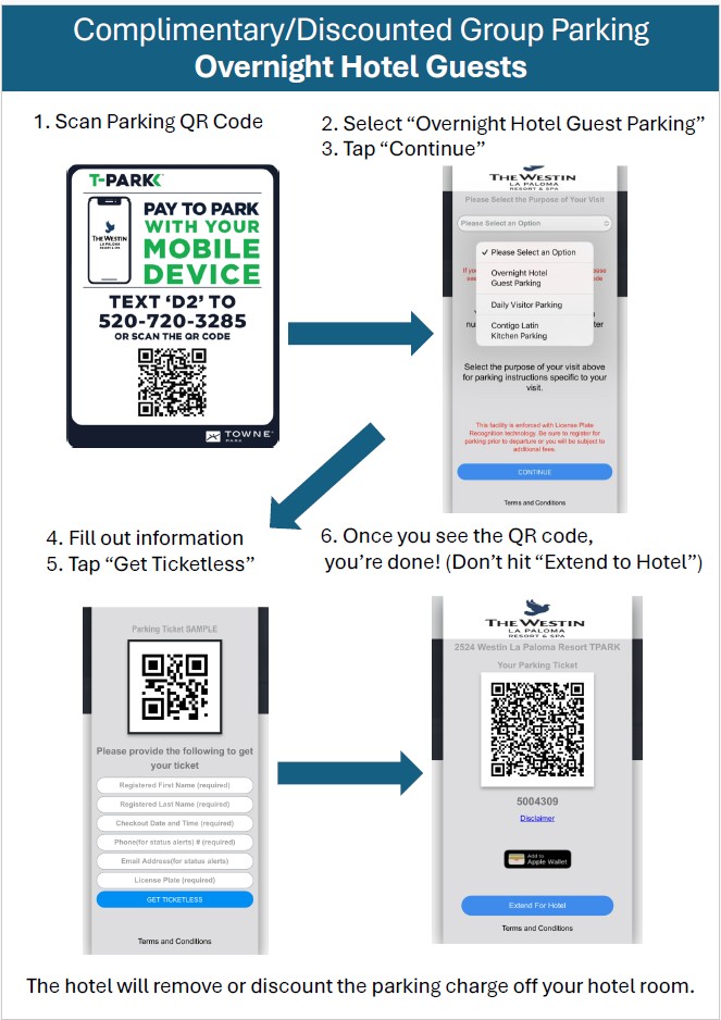Overnight Guests/Staying at Hotel: Follow the instructions below, and the hotel will comp the parking rate off of your room.